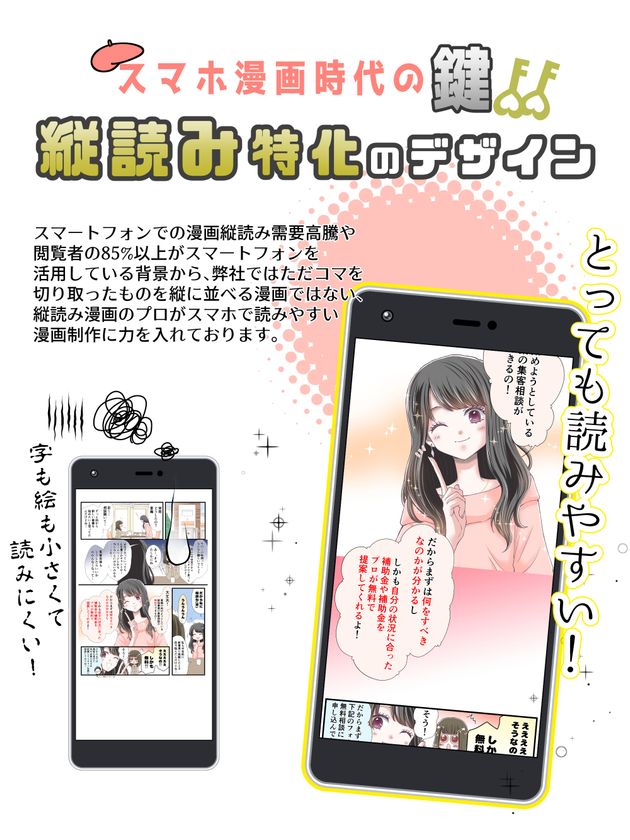 さらに昨今では、スマートフォンでの漫画縦読み需要高騰や販売サイト等の多くで閲覧者の85%以上(※当社調べ)がスマートフォンを活用している背景から、当社では、ただコマを切り取ったものを縦に並べる漫画ではない、縦読み漫画のプロがスマホで読みやすい漫画制作に力を入れリニューアルしております。
