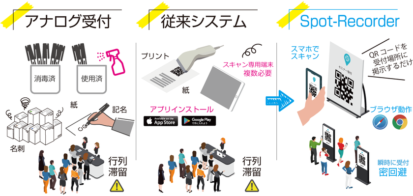 「Spot-Recorder(スポットレコーダー)」は、各種イベント、展示会、会議、ショールームなどの受付作業を簡単に行うシステムです。来場者は自身のスマホで、会場に貼られた「受付QRコード」を読み込むだけで受付が完了します。専用端末やインストール作業不要で、手軽に完全非接触受付が導入できます。