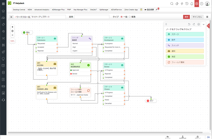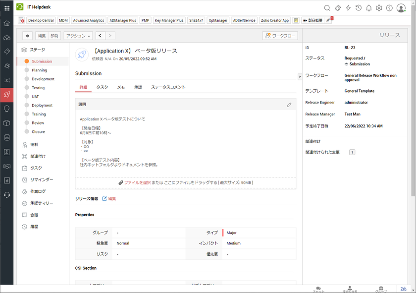 ゾーホージャパン株式会社(代表取締役:Manikandan Thangaraj - マニカンダン・タンガラジ、本社:横浜市、以下 ゾーホージャパン)は、ITサービスマネジメントツール「ManageEngine ServiceDesk Plus(マネージエンジン サービスデスク プラス、以下 ServiceDesk Plus)」の最新版「Version 13.0」を、2022年6月22日に提供開始しました。本最新版は、リリース管理機能を実装しています。