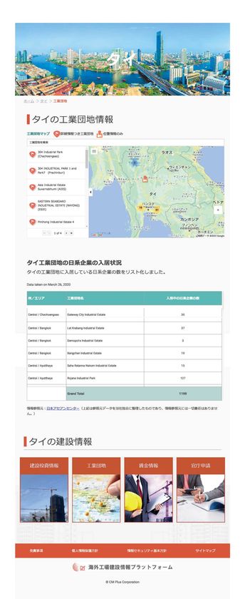 株式会社シーエムプラス(以下「当社」)は、本邦企業の海外進出支援を目的とした、アジア各国の建設関連情報をワンストップで提供する情報ポータル「海外工場建設情報プラットフォーム」( https://og.cm-plus.co.jp )の掲載コンテンツを大幅に更新し、工業団地の地図検索機能を追加しました。