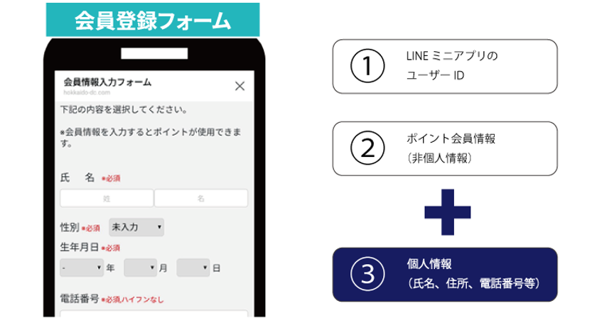店舗でアプリを運用するためには、新たなアプリのダウンロードや、Eメールアドレス認証、個人情報の入力などが障害となり、「簡単には会員になってもらえない」といった状況がありました。また、企業としては入力してもらった個人情報をどのように管理すべきか、会社のプライバシーポリシーに反しないかといったことも検討事項となります。当システムではこれら点について「LINEミニアプリ」を利用することで解決することができます。「LINEミニアプリ」は、ユーザーに新たにアプリをダウンロードしてもらうことなく、企業はLINEアカウントに紐づいたユーザーデータを取得*し、自社のサービスの改善や「LINE公式アカウント」「LINE広告」等を通じたマーケティング施策に活用できることが特長となっています。