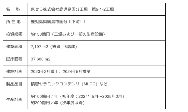 京セラ株式会社(社長:谷本 秀夫)は、積層セラミックコンデンサ(MLCC)の生産容量の拡大や技術開発力の強化、将来を見据えた生産スペースの確保などを目的に、鹿児島国分工場内に第5-1-2工場を建設することを決定しましたので、お知らせいたします。本日、地元自治体である霧島市と立地協定締結の調印式を行った後、本年9月より既設研究棟を解体し、2023年2月より新工場棟の建設を開始する予定です。