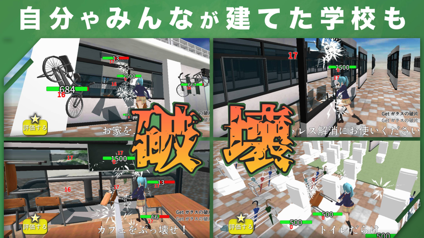 学校を作るモードで、机や壁などを自由に配置して、自分の好きなように学校を作ることができます。作った学校は自分で破壊するだけでなく、インターネット上で公開することができ、他のユーザーにも共有することができます。