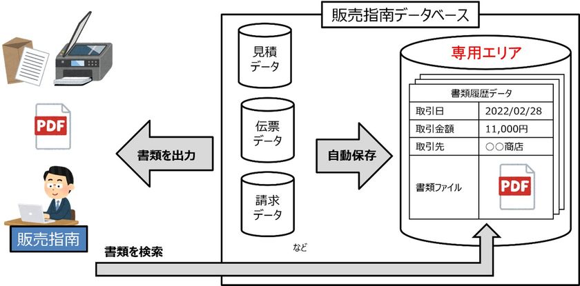 (1)販売指南から各関連書類(売上伝票や請求書など)出力時に、書類を自動で電子化しデータベース内の専用のエリアに保存します。