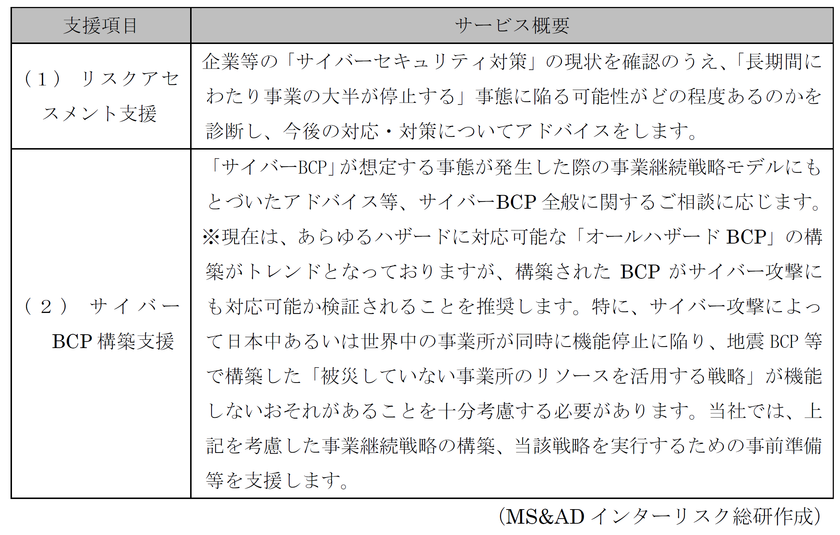 MS&ADインシュアランス グループのMS&ADインターリスク総研株式会社(代表取締役社長:中村 光身)は、2022年8月より「サイバーBCP」に関するコンサルティングサービスの提供を開始しました。本サービスは企業等のサイバーセキュリティ対策の現状を確認のうえ、被害の発生可能性や影響を診断し、対策についてアドバイスを行う「リスクアセスメント支援」、および、サイバー攻撃により「長期間にわたり事業の大半が停止する」事態を想定した「サイバーBCP」に関する企業等の対策支援を行うものです。