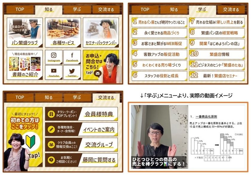 「知る」「学ぶ」「交流する」の3つから、その都度必要な項目が選択できる。「学ぶ」ではパン屋さんの継続経営に必須のマーケティング原則を短時間に学べるWeb講座が視聴できる。