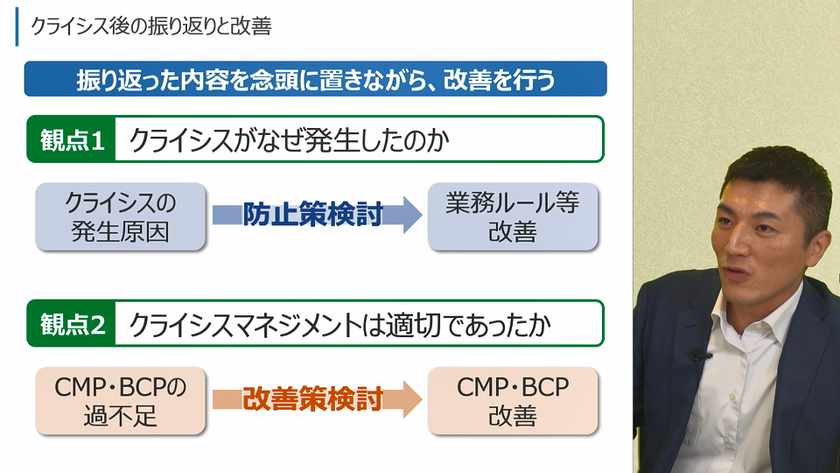 今回追加する2つのeラーニングのうち、「基礎から学ぶクライシスマネジメント」では、新たに管理者となる方に向けて、企業における危機管理の事後対応知識を、習得できる内容となっています。「基礎から学ぶリスクマネジメント」では、従業員一人ひとりのリスク意識を高め、日常業務における気づきを改善に繋げるリスクマネジメントの考え方を分かりやすく解説しています。