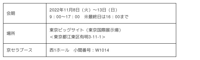 京セラ株式会社(代表取締役社長:谷本 秀夫)は、2022年11月8日(火)から11月13日(日)までの6日間、東京ビッグサイト(東京国際展示場)で開催される「JIMTOF 2022」(第31回日本国際工作機械見本市)に出展しますので、お知らせいたします。