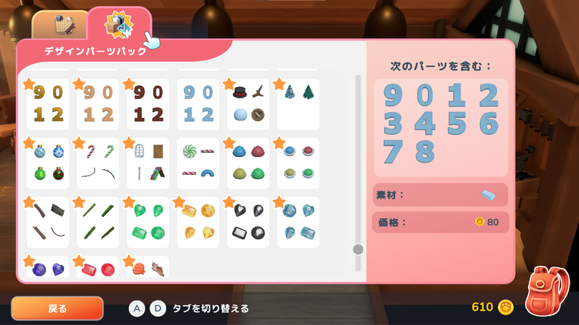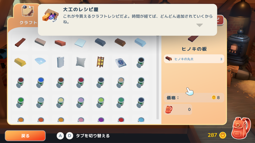 生地、金、銀、銅、レンガ、丸太、塗料、布染料など、クラフトに使うあらゆる材料を扱えます。右の欄で指定された素材を集めて加工すれば、材料を作り出してデザインを実物にすることができます。町の森や鉱山から材料を集めるだけでなくて、モスの雑貨屋で種や接着剤、布染料のベースなどの一般的な素材を購入することもできます。