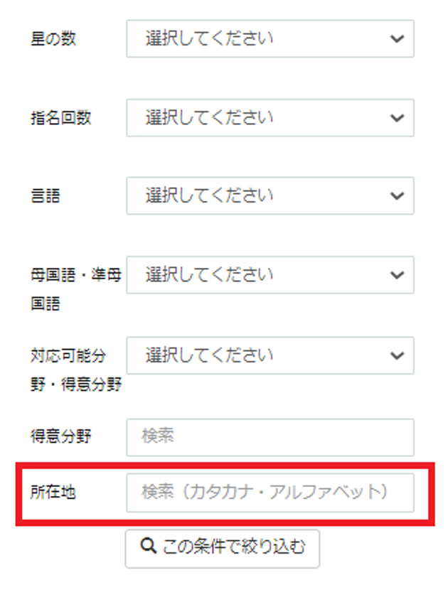 会員ページの「翻訳者の検索」タブ、所在地検索ボックスに、「都道府県」「国」「州、市」を入力し、ご希望の地域に所在する翻訳者を検索していただくことができます。