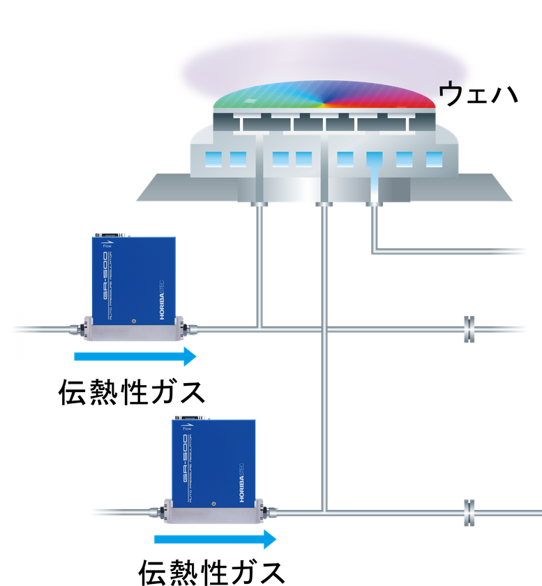 堀場エステックが開発・販売するウェハ裏面圧力制御システムGRシリーズは、チャンバーにつながるラインに設置して伝熱性ガスの圧力制御を安定性良く高精度に行い、精密なウェハ温度制御に貢献してきました。