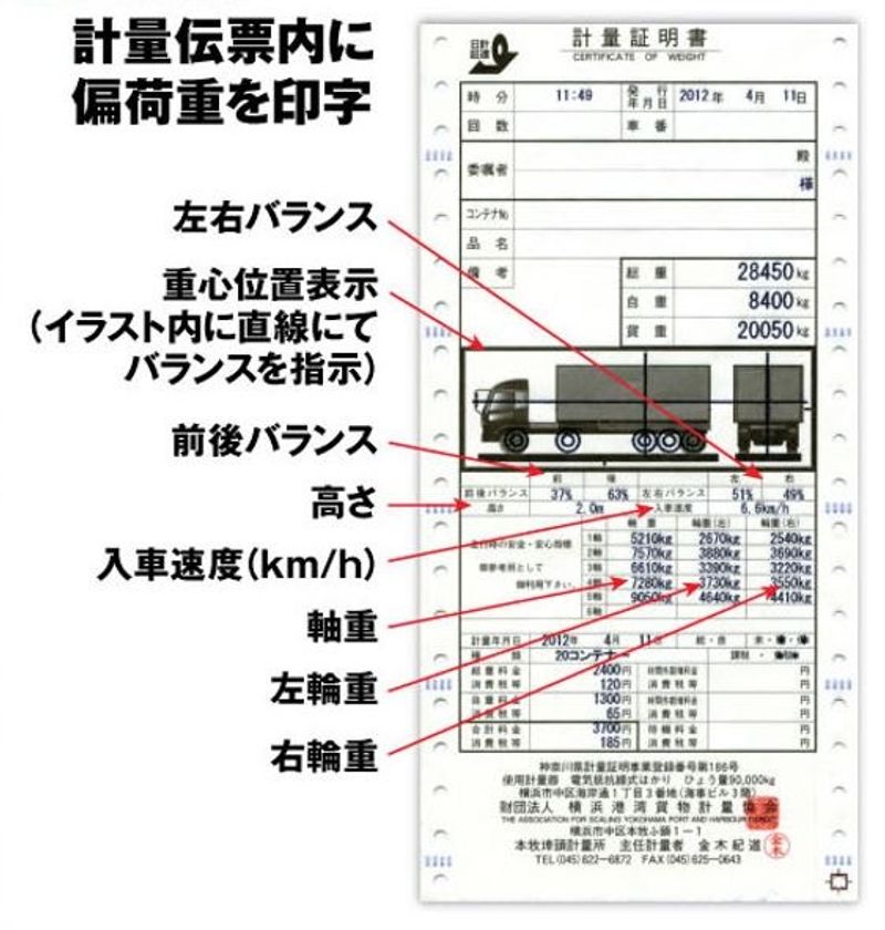 鎌長製衡の「サトルス」は車輌がトラックスケールに載るだけで開梱することなく積み荷の重心位置を三次元(前後、左右、高さ)で把握することができるため、危険性の高い車輌の発見に役立ちます。