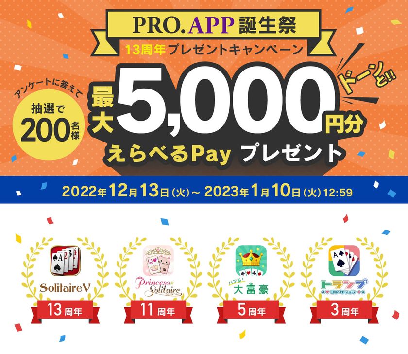 本日12月13日(火)より、日頃のご愛顧に感謝を込めて、抽選で200名様にえらべるPayが当たる「PRO.APP誕生祭」13周年プレゼントキャンペーンを開催いたします。