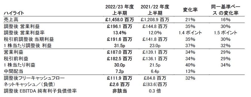 ・同一基準ベースでの変化率は、買収の影響や海外の業績の為替換算時の為替レートの変動の影響を排除したもので、2021/22年度は2022/23年度の平均為替レートで換算します。また、売上高は、年ごとの営業日数の相違による影響を排除するよう調整されています。買収先企業の業績は1年経過後に初めて組み込まれ、その時点でその期と比較対象期の両方に同じ月数分の業績が反映されます。為替変動により売上高は4,870万ポンド増加し、期間中の営業日数の違いにより売上高は800万ポンド減少しました。為替変動により、税引前調整後利益は580万ポンド増加しました。