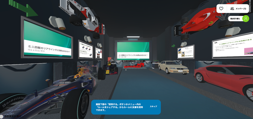 (1)「研究発表会」では、自然科学部の中学・高校有志生徒が日頃から興味を持っている研究テーマについて、メタバース空間を生徒自身がデザインし、動的な表現や通常教室に持ち込めないものを持ち込むなど、現実では表現が難しい方法も含めて生徒が自由に表現を行える環境を構築。2022年10月に行われたリアル学園祭でメタバース空間を使って発表を行いました。