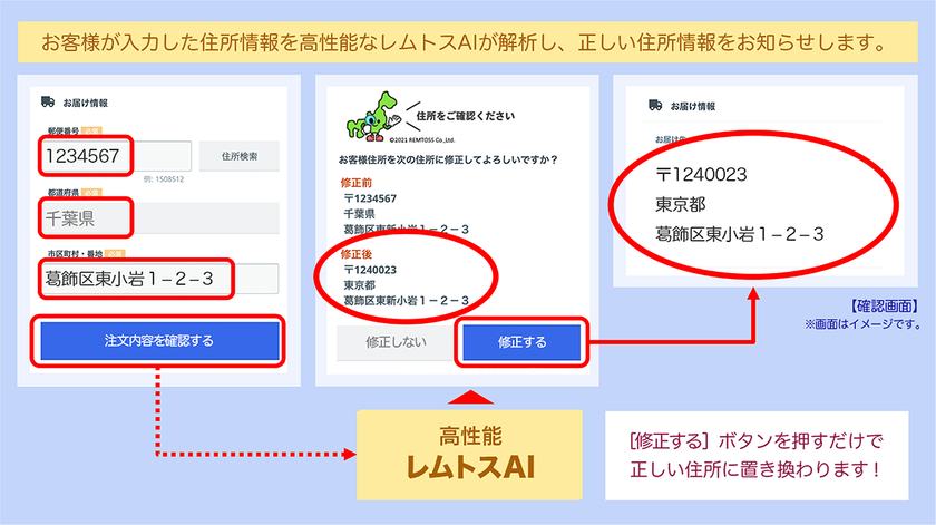 お客様は表示内容を確認して[修正する]ボタンを押すだけで、自動的に正しい住所に置き換わります。