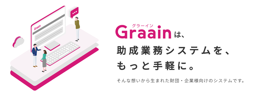 Graainは、研究・事業への資金の提供事業、奨学金事業における申請業務(申請受付・審査・結果報告)をサポートする助成業務システムです。申請者や審査担当者とのコミュニケーションツールやリマインド機能も充実。セキュリティ面でもデータの暗号化を行うなど、安心・安全な事業担当者の省力化に貢献しています。また、「助成業務システムをもっと手軽に」導入いただくことを目的としたGraainは、Saas型の助成業務システムとして導入コストを大幅に下げ、導入期間も最短7日間での導入を実現しています。