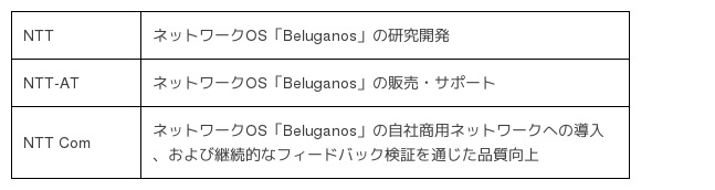 また、NTTコミュニケーションズ株式会社(以下、NTT Com)は、自社の商用ネットワークに「Beluganos」搭載のホワイトボックス装置を導入し運用をします。3社は連携し、NTT Comへの導入を通じて確認された高い信頼性と機能性を持ち合わせたネットワークOSを市場に供給することで、お客さまのネットワーク品質の信頼性・機能性の向上に加え、構築時の柔軟性・経済性の向上を実現していきます。