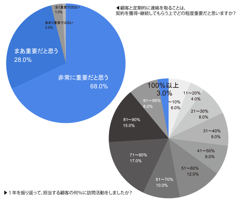 では、実際に現場では顧客に定期的な連絡ができているのでしょうか?「1年を振り返って、担当する顧客の何%に訪問活動をしましたか?」との問いに対し、平均は60%程度で、すべての顧客に訪問できていたのはわずか3%にとどまることが分かりました。平均して約40%の顧客は、1年間なんのタッチもされず、放置されているのです。「Web会議システムを使わなくても顧客と十分にタッチできる、と考えている方が55%」いると前述しましたが、事実とイメージに大きな差があることが分かります。これは深刻な事態です。
