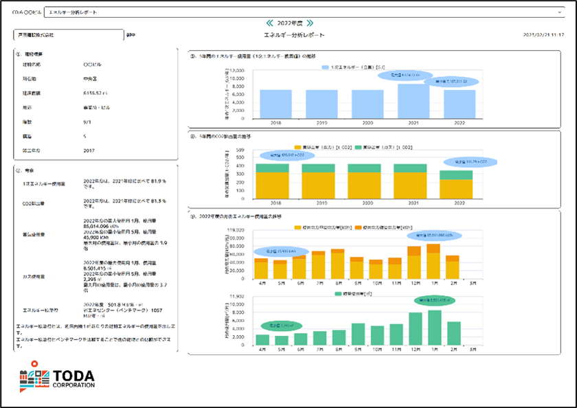 分析機能では、取得したエネルギーデータを延床面積や建物構造といった建物データと関連付けることができ、前年度のエネルギー分析レポートを始めとする各種グラフを自動生成することが可能です(図3)。戸田建設はこの機能を用いて簡易の省エネ診断を行い、各種エネルギーマネジメントや省エネソリューションを提供します。