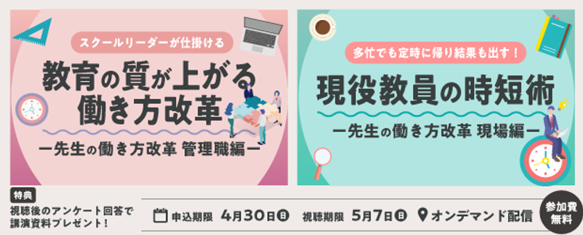 株式会社東洋経済新報社(所在地:東京都中央区、代表取締役社長:田北 浩章)は、教員、各地域教育委員会など教育従事者の皆様を対象としたウェビナー『スクールリーダーが仕掛ける、教育の質が上がる働き方改革』と『多忙でも定時に帰り結果も出す!現役教員の時短術』を2023年5月7日(日)までオンデマンド配信中です。申込期限は2023年4月30日(日)です。