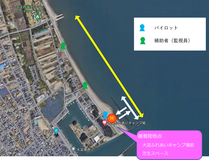 自動飛行(黄):離陸地点より約50m海側へ移動し左右600m程度飛行