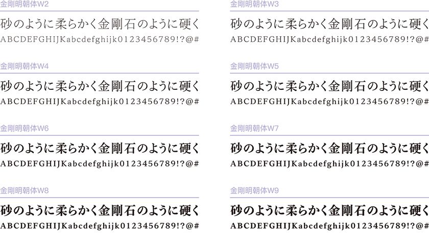 W2~W9までの8種類のウエイトで展開しており、キャプションから本文、見出しといった小さなサイズでの使用から大きなサイズの使用まで、様々なニーズに対応できます。