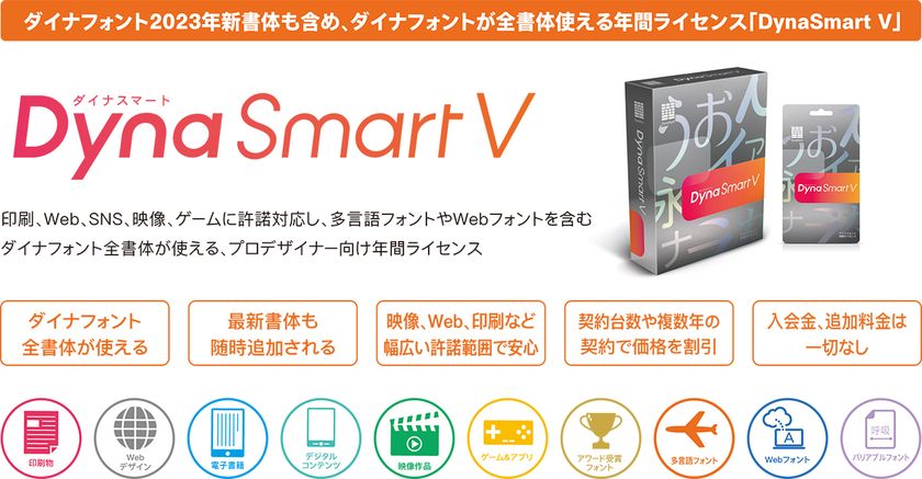 「DynaSmart V」は、国内外のアワードを受賞した優れたデザインのフォントや多言語フォントを含むダイナフォント全書体を収録し、印刷物、Webデザイン、映像・動画、デジタルコンテンツ、ゲームといった幅広いコンテンツにダイナフォントを許諾対応した、安心の年間ライセンスです。