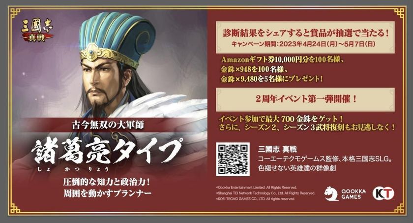 Qookka Entertainment Limitedより絶賛配信中のシミュレーションゲーム『三國志 真戦』にて、4月24日(月)より「ビジネス能力診断」が期間限定で開催されます。同時に超豪華賞品が当たるTwitterキャンペーンも実施!