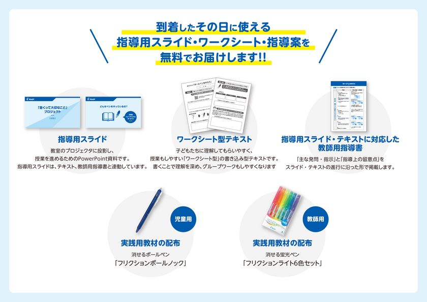 初年度である本年は、授業に参加した児童全員に同社の消せるボールペン「フリクションボールノック」を1本ずつ提供。さらに授業をする教員には実践用教材として、消せる蛍光ペン「フリクションライト6色セット」3セットを、先着100クラスにお送りいたします。奮ってお申込みください。