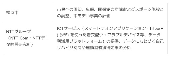 横浜市では、心疾患患者が治療後も地域、在宅で切れ目なく運動継続できるように地域連携体制の構築に取り組んでいます。また、市内のスポーツ施設と連携し、心臓リハビリテーションができる環境整備を進めています。自己リハビリモデル事業(以下 本モデル事業)は、NTTコミュニケーションズ株式会社(以下、NTT Com)および株式会社NTTデータ経営研究所をはじめとするNTTグループ(以下、NTTグループ)の提供するICTサービス「みえるリハビリ(※1)」を活用することで、スポーツ施設や自宅周辺等のお好きな場所で安心して自己リハビリに取り組んで頂き、健康寿命延伸への貢献をめざします。