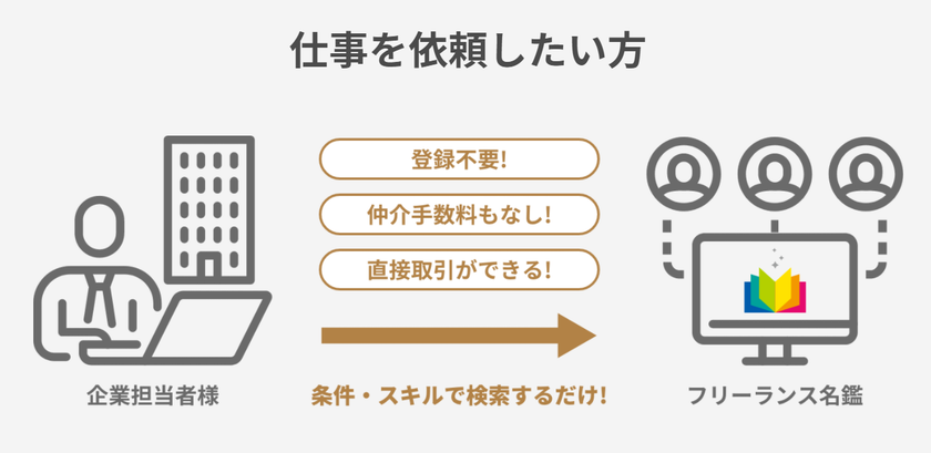 このような課題を解決するため、【手数料無料】かつ【優良フリーランス多数在籍】という特徴を備えた『フリーランス名鑑』を開設いたしました。