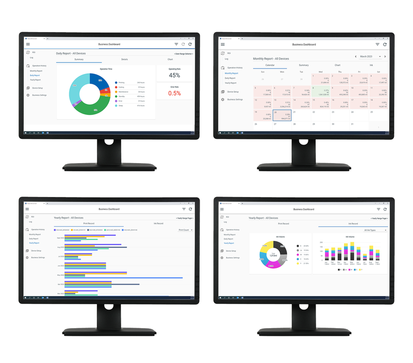 ひとつめは、さまざまなデータを多角的に分析できるよう機能拡張した「ビジネスダッシュボード」です。複数のプリンターのインク消費量、印刷時間、出力平米数、使用時間の詳細情報や、目標稼働率の達成度などを可視化できるようになるため、より収益性の高いビジネスプランの策定をはじめ、効率的なマネジメントや無駄のない在庫管理にご活用いただけます。