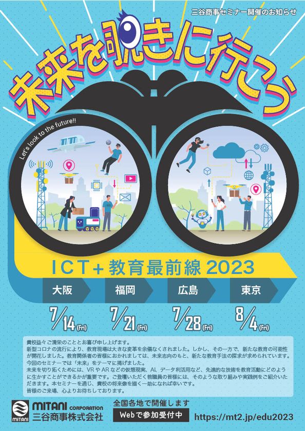 三谷商事株式会社(所在地:福井県福井市、代表取締役社長:三谷 聡)は、無料セミナー「『ICT+教育最前線2023』 ―これからの教育の“姿”―」を、2023年7月14日(金)より全国4か所で開催いたします。
