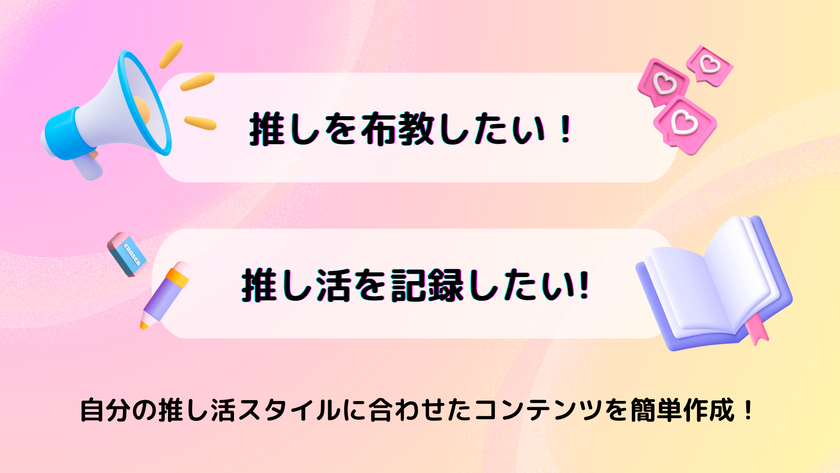「推し活レポ」「推し布教」「推し活HOW TO」など、ユーザーの推し活スタイルに合わせて、幅広い推し活コンテンツの記事を投稿できます。