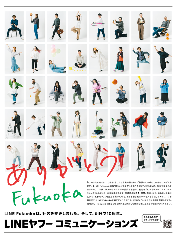設立から10年間、長きにわたる福岡の皆さまのご支援に深く感謝申し上げます。この節目の年に、LINEヤフーのサービスを支えてきた当社社員の個性豊かな表情と共に、福岡の皆さまへの心からの感謝を込めたメッセージを制作いたしました。