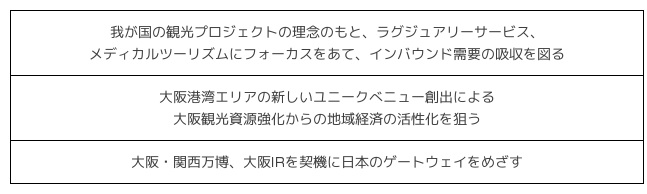 本事業は大阪・関西万博開催の2025年春から段階的な事業開始を予定しており、大阪港湾エリアの更なる価値向上、大阪・関西万博成功への貢献、大阪港湾を起点とした回遊性による関西圏全体の活性化、そして観光立国復活への貢献にも取り組みます。