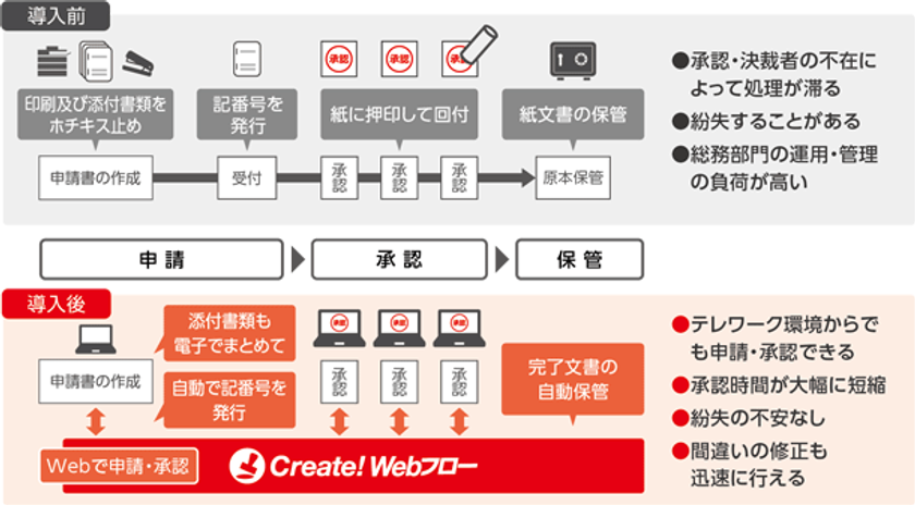 Create!Webフロー(クリエイト ウェブフロー)は、稟議書や見積書、経費精算書など紙による申請・決裁業務をそのまま電子化するためのワークフローシステムです。