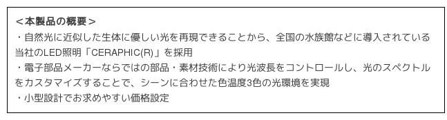 本製品は、これまで全国の水族館で多数採用いただいた照明を、一般のお客さまにも広げていきたいという思いから、小型に設計し、ご自宅で植物を育てる際にも適切な育成環境と雰囲気の創造を可能としています。