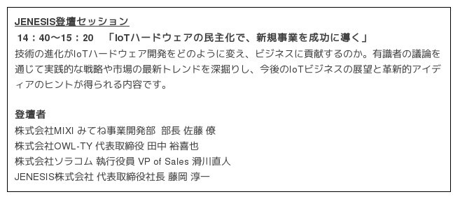 IoTのプロフェッショナルが集い、イノベーションの創出が期待される「SORACOM Discovery」をプラチナスポンサーとして支援することは、JENESISがソラコムとの取り組みを通じて培ってきたノウハウや技術力を広く示すとともに、市場の発展に寄与する重要な機会であると捉えています。