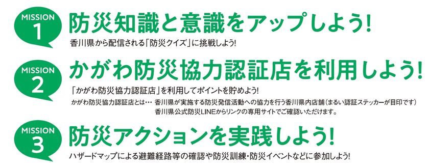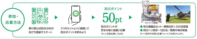 内容は、香川県公式防災LINEを友だち登録して、3つのミッションをクリアしてもらえる「防災ポイント」を50ptためる毎に防災備蓄品などがあたる抽選に応募いただけます。