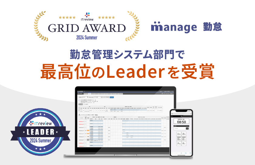 株式会社COEL(代表取締役社長:深見 和久)が提供するクラウド勤怠システム「manage 勤怠」は、ITreview Grid Award 2024 Summerの勤怠管理システム部門にて、最高位の「Leader」を受賞したことをお知らせします。