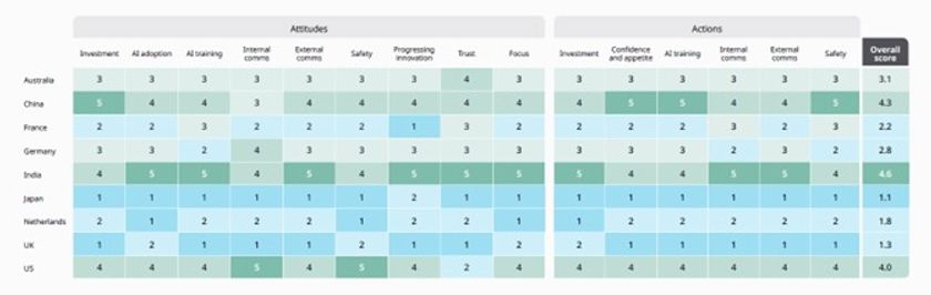 BSIのAI成熟度モデルは、世界の企業におけるAI導入に対する組織の信頼度や準備態勢を含む一連の指標を評価し、重み付けを行い、1から5の間でスコア化するものです。その結果、最もAIが成熟していない市場は日本で1.06でした。一方で最も成熟している市場はインドで4.58、また2位の中国は4.25でした。すべての指標において、中国とインドがリードし、米国が3位、オーストラリアが続いています。
