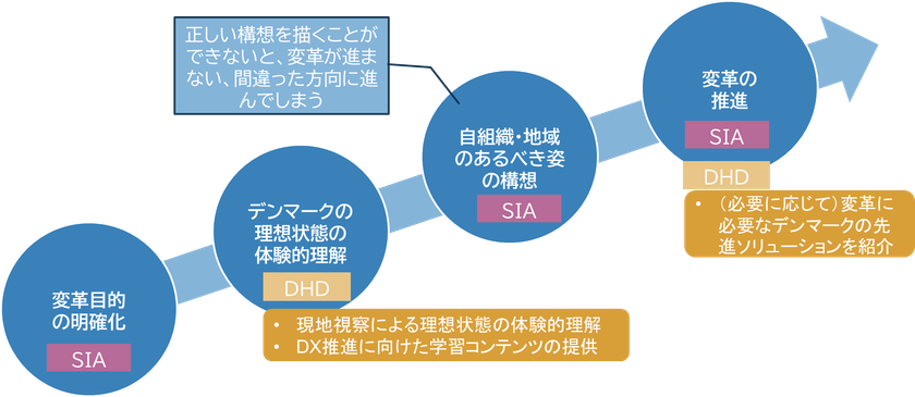 SIAは、デンマークの企業・団体と連携しながら、日本でデジタル変革を推進したい自治体・企業の支援を多く実施しており、DHDは、デンマーク型のデジタル変革の理想状態や実現方法に関するナレッジやコンテンツを有している。SIA・DHD双方のノウハウ・チャネル・コンテンツを組み合わせることで、デジタル変革を実現したい顧客に対して、視察単体ではなく、カスタマージャーニーに沿って、事前・事後の接点を持ちながら、変革の伴走支援を行う枠組みを構築することができる。