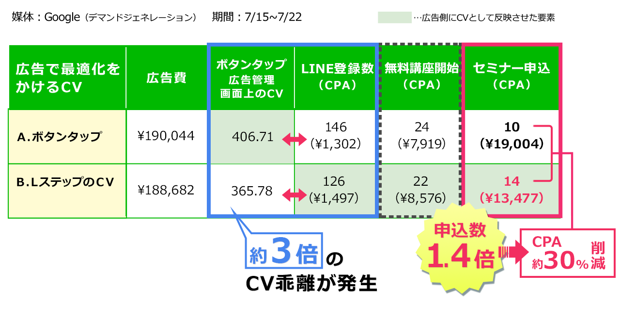 しかし、A(LPボタンタップ最適化)とB(LINE登録最適化)を比較すると、Bパターンはセミナー申込数が1.4倍に増加し、CPAも30%削減。
