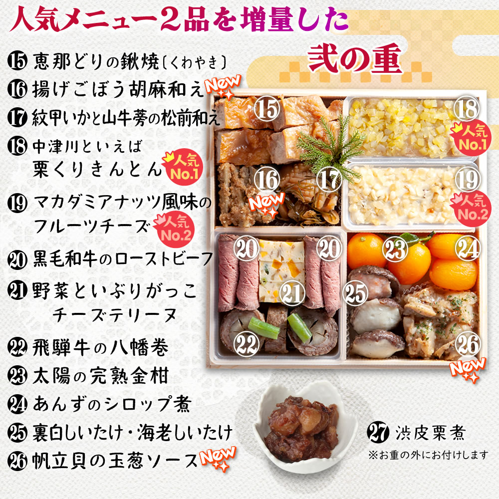 特に、冷凍便「人気2品4倍 三段重」は、人気No.1「栗くりきんとん」と人気No.2「マカダミアナッツ風味フルーツチーズ」が従来の4倍に増量された新商品として登場。