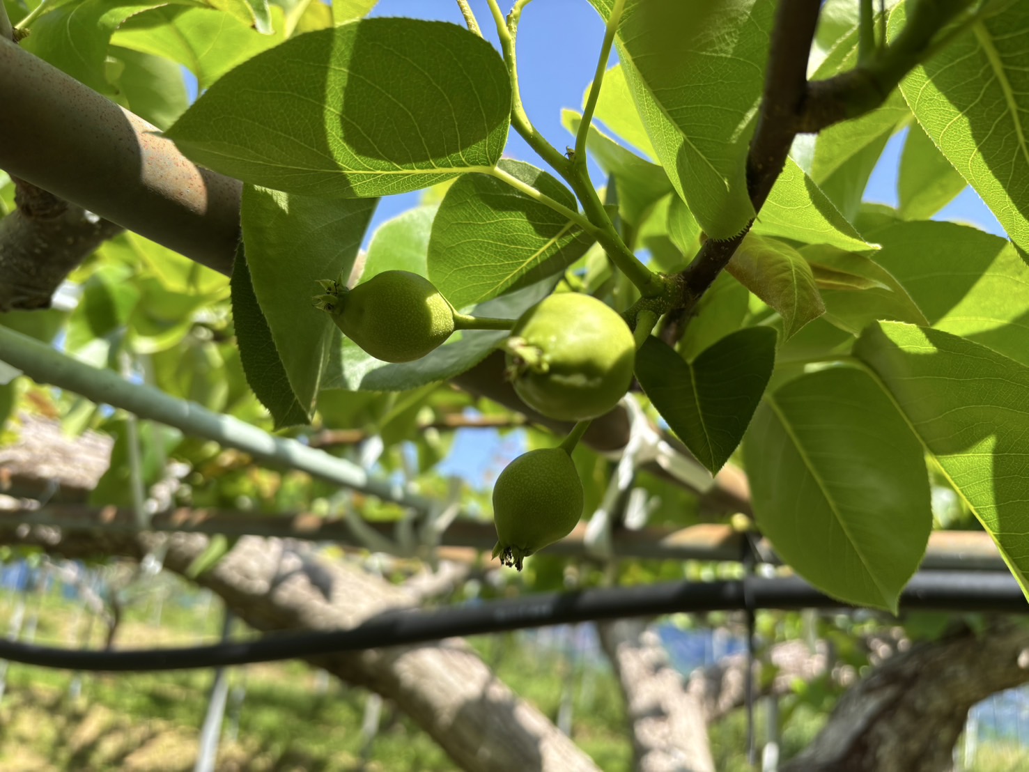 現在、果実は順調に生育中です。宇宙花粉で授粉された果実が育つ様子は、まさに“宇宙の記憶をたどる梨”。秋の収穫・販売に向けて、丹念に育てられています。