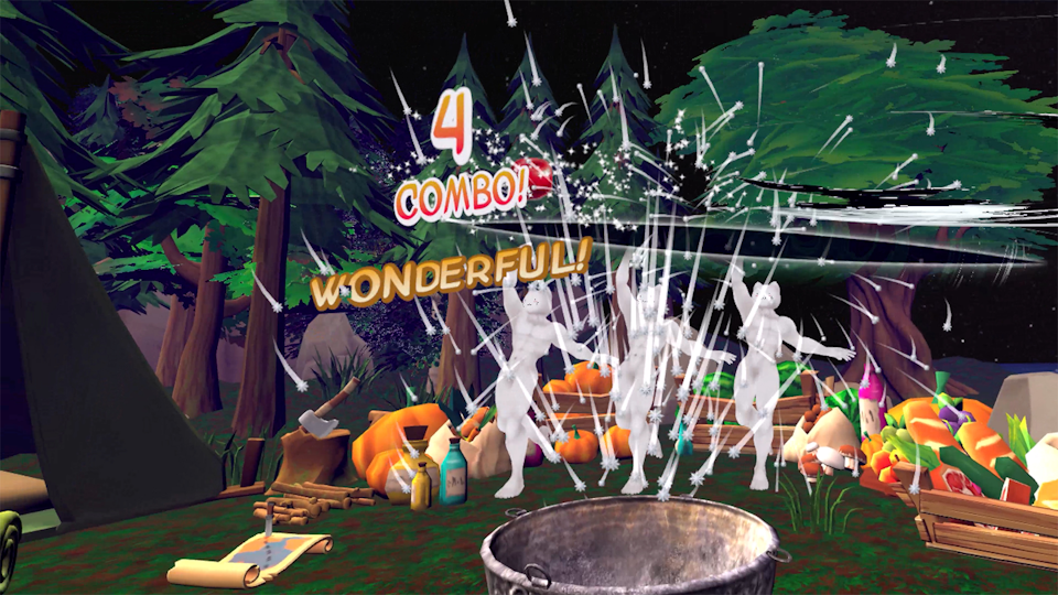 軽やかで、なんとなく聴き慣れたBGMと共に、猫のような不思議な生き物が投げ込む「あらゆるもの」を斬っていくスポーティなプレイフィールが気持ちよく、食材が上手くカットできたかどうかを「魔法の鍋」に搭載されたAIが分析し、現実世界なら「食べられないのでは?」といったものでも、「美味しそうな料理」として生成します。