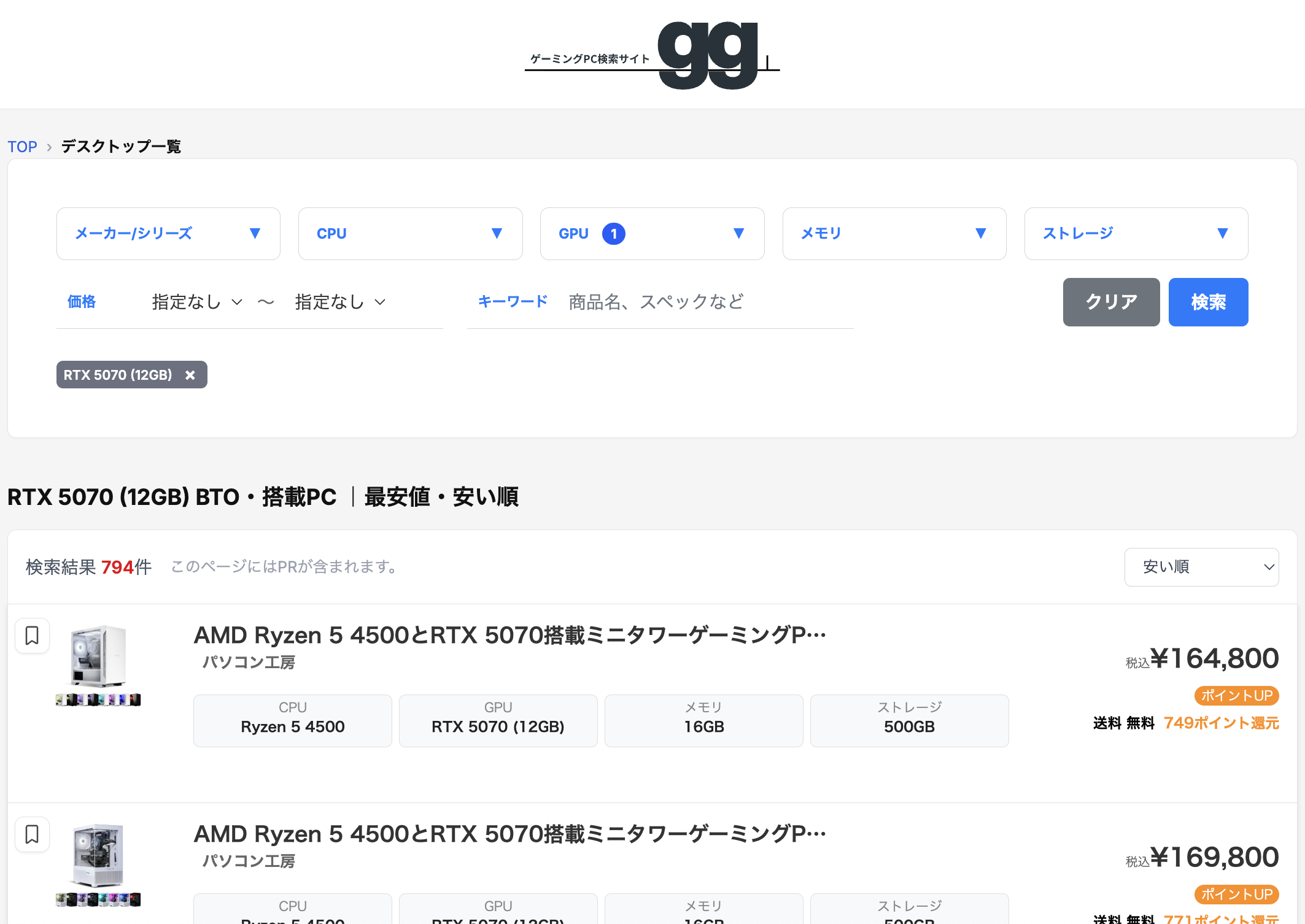 ゲーミングPC検索サイト「gg(ジージー)」は、ドスパラ、マウスコンピューター、パソコン工房をはじめとした国内主要な12メーカー・約5,700件のゲーミングPCをまとめて検索・比較できるデータベース型検索サイトです。
