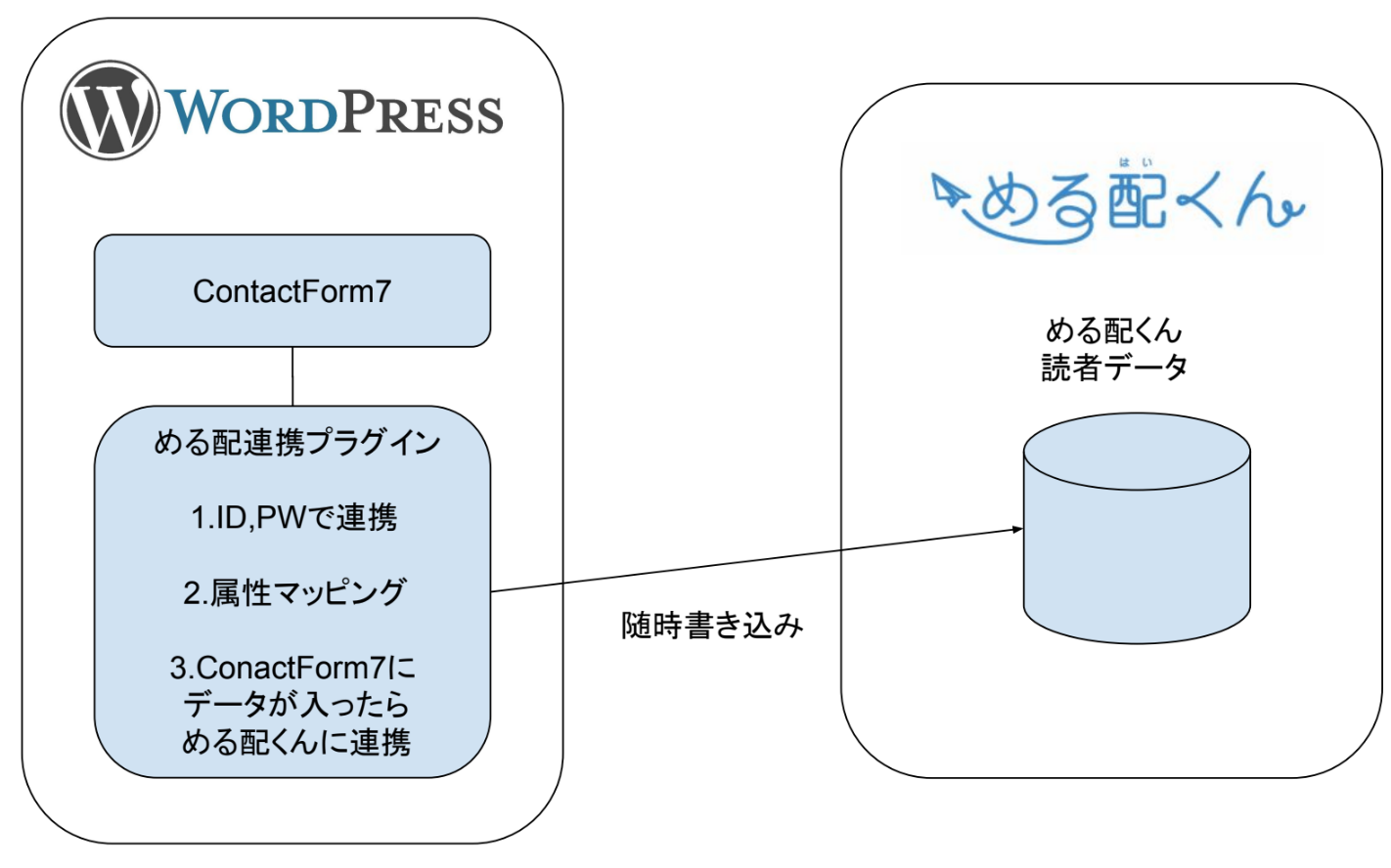 本機能により、キントーンおよびワードプレスで収集された顧客情報を「める配くん」へ自動登録し、そのまま一斉メール配信やステップメール、誕生日メール等に活用できるようになります。さらに、会社名・役職などのカスタム項目のマッピングにも対応しており、外部のシステムとスプレッドシートを介した連携も可能となります。